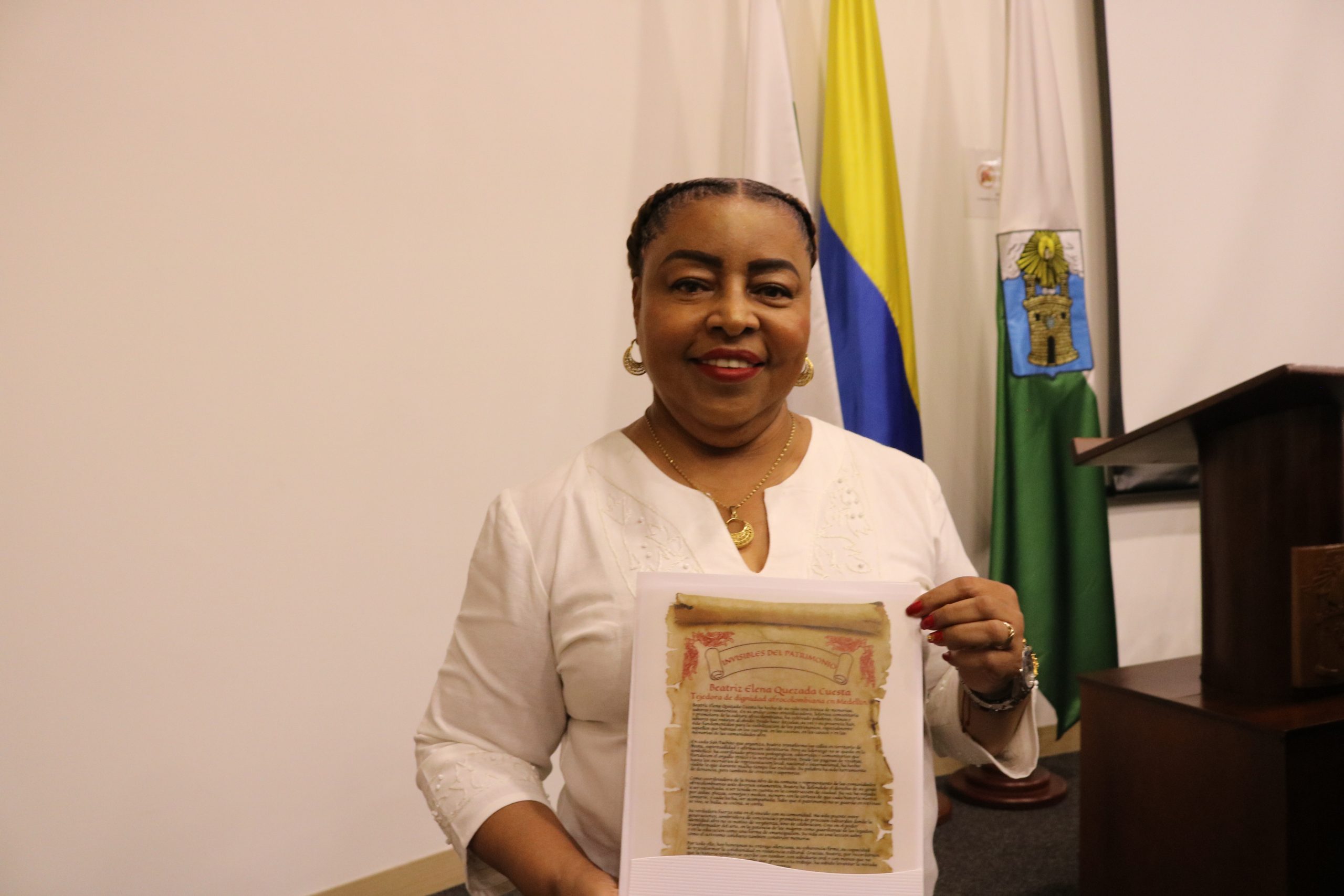 La presidenta de la Asociación Intercultural Colombia Diversa, AICOLD Beatriz Elena Quesada Cuesta, recibió un reconocimiento de manos del Consejo de Patrimonio de Medellín, por dedicar su vida como lideresa afrocolombiana, visibilizando las palabras, ritmos y sabores que se resisten al olvido.